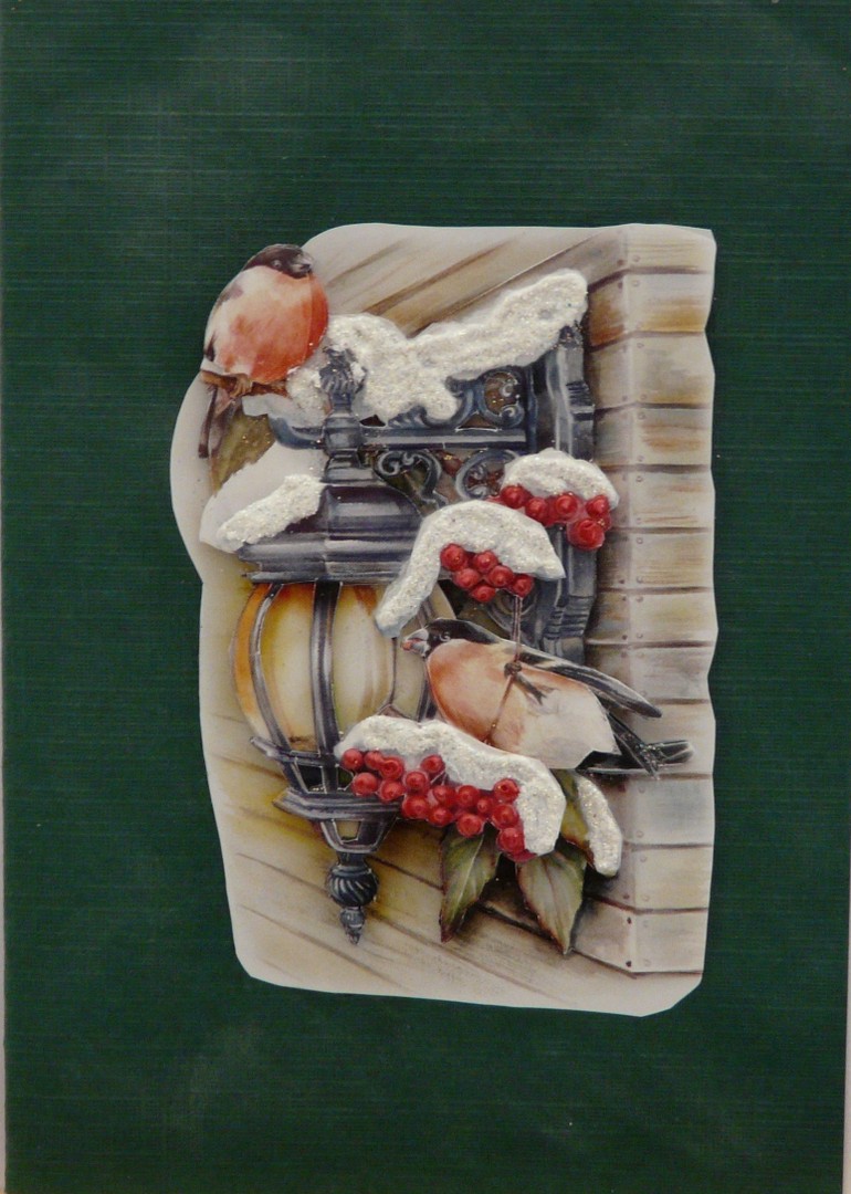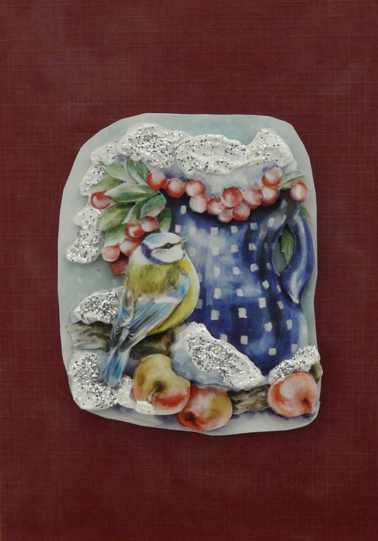 Une carte de noël représantant une nature morte avec un oiseau dessus.