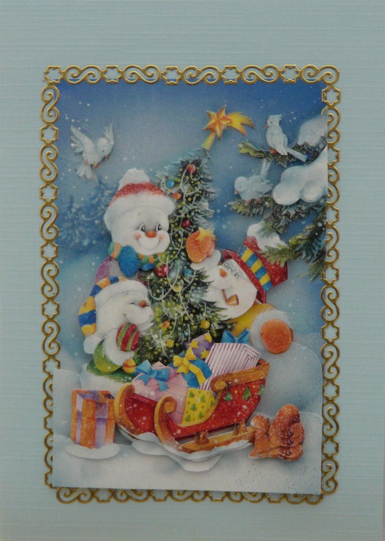 Une carte de Noël représentant trois bonhomme de neige autour d'un sapin